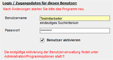 Mit dem nächsten Start der Anwendung ist die Benutzerverwaltung aktiv. Beim nächsten Programmstart werden Sie dann mit einem Login nach Benutzername und Passwort gefragt.