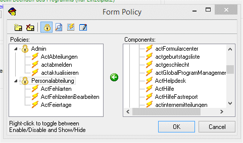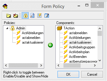 Die Componenten rechts zeigen nur mehr die Aktionen an, für die Rechte gesetzt werden können.