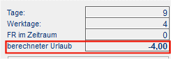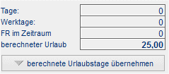Die Tage, Werktage, enthaltene Freitage und angefallenen Urlaubstage in dem gewählten Zeitraum werden vom System automatisch errechnet und es ergibt sich der berechnete Urlaub.