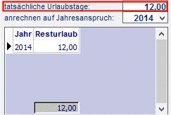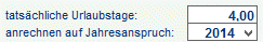 Beispiel: ein MA tritt unterjährig in das Unternehmen ein (nehmen wir an am 30.05.2014) Sie buchen den Urlaub über dieses Formular ein. Sein Urlaubsanspruch beträgt pro Jahr 25 Tage. Das heißt für 2014 hat er Anspruch auf 12 Tage.