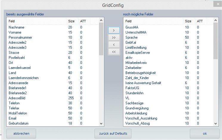 Feldnamen, die links stehen, werden in der Liste angezeigt.