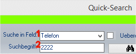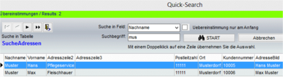 Das Formular "Quicksearch" öffnet sich nur, wenn Cadia mehrere Ergebnisse zu einer Suchanfrage vorfindet.