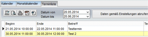 Die Tabelle listet dann alle in diesem Zeitraum liegenden Termine und Sie können sich über die Navigation eine Liste drucken.