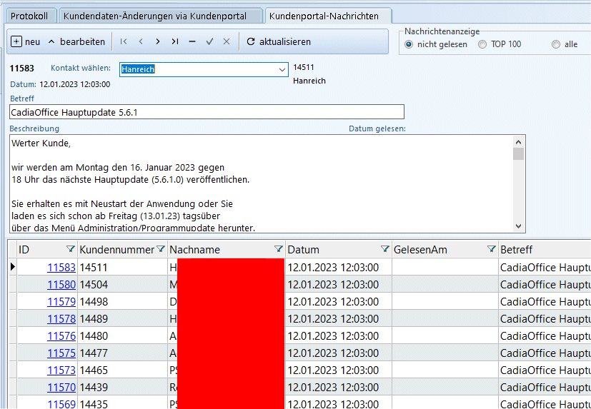 Bild2: Im den Kundenportal-Nachrichten werden dann sämtliche übermittelte Nachrichten - an jeden Kunden dargestellt: