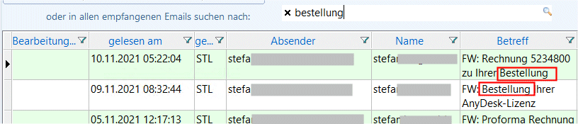 In unserem Beispiel unten suchen wir nach "bestellung", die Liste zeigt nur mehr Zeilen, in denen dieser Begriff enthalten ist.
