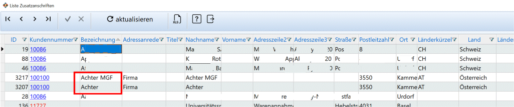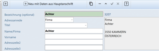 In der Liste der Zusatzanschriften werden sämtliche Anschriften Ihrer zusätzlich angelegten Liefer- und Zusatzanschriften in den Einzelkontakten (Kontaktverwaltung) gelistet.