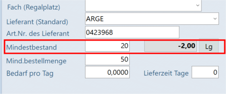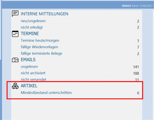 Im Startfenster im Menü sehen Sie die Anzeige, wenn bei einem Artikel der Mindestbestand unterschritten ist: